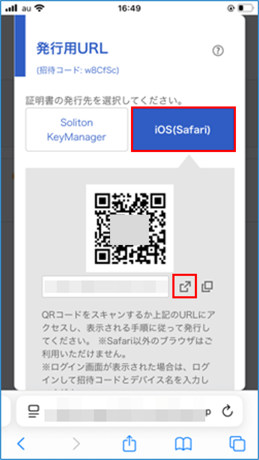 [iOS(Safari)]が選択されていることを確認し、QRコード右下に表示されている矢印のアイコンをタップする