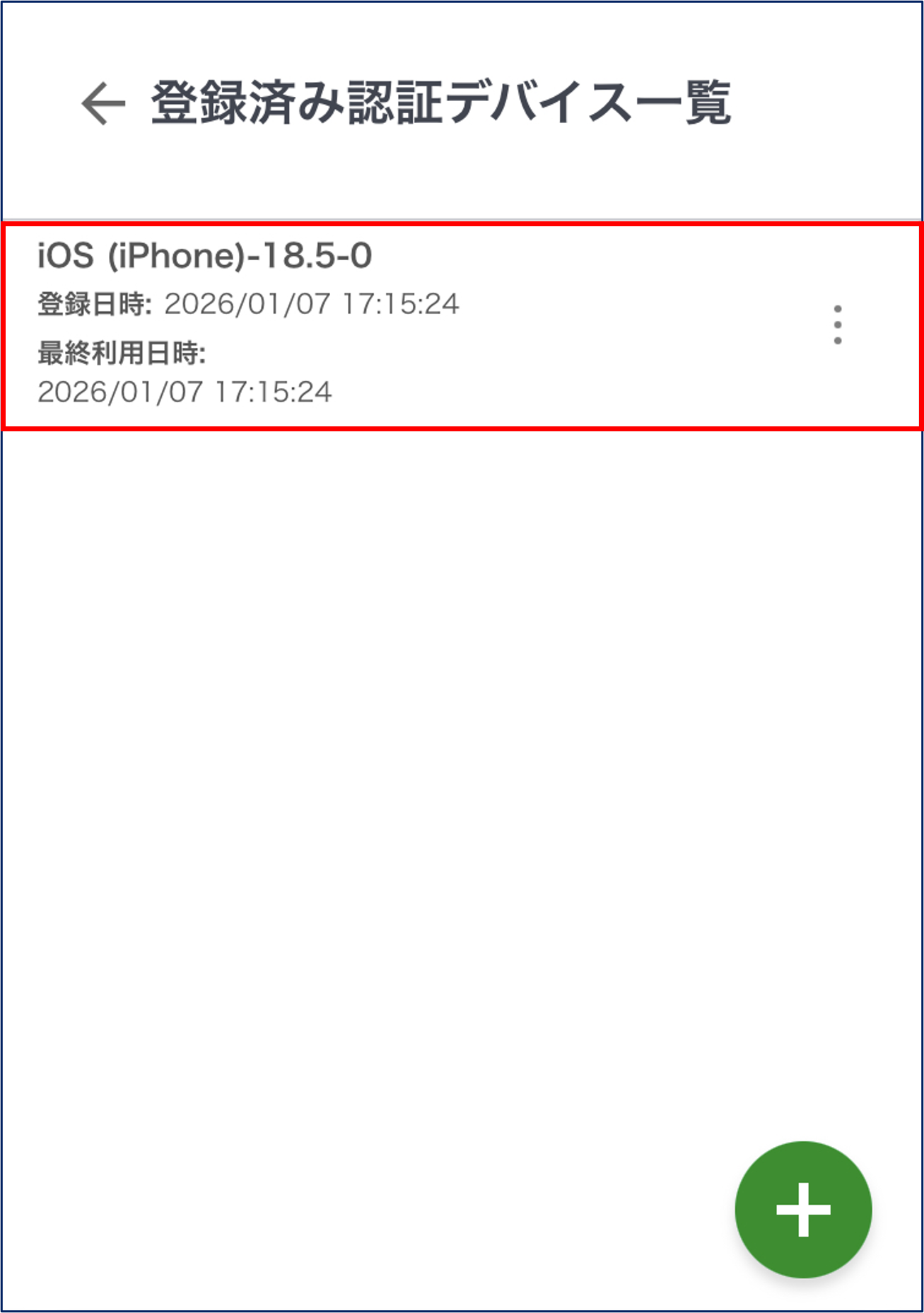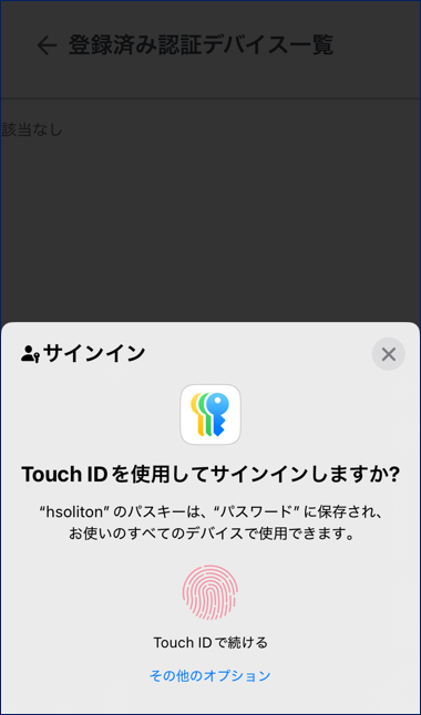 「登録済み認証デバイス一覧」画面で、iPhoneの生体認証情報がFIDO2認証デバイスとして登録されたことを確認する