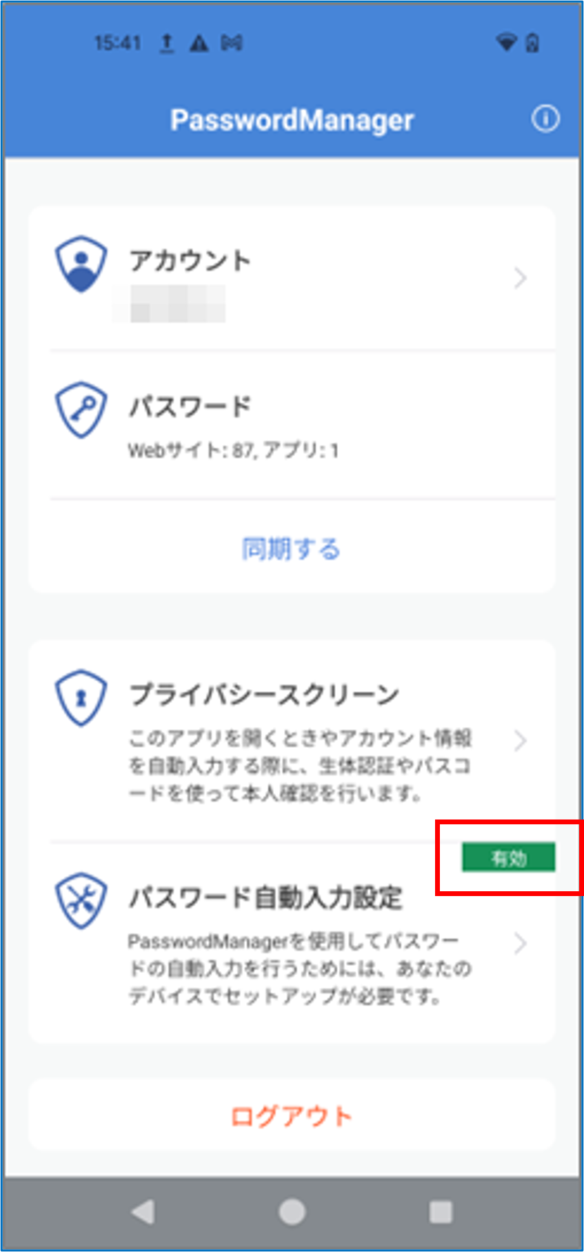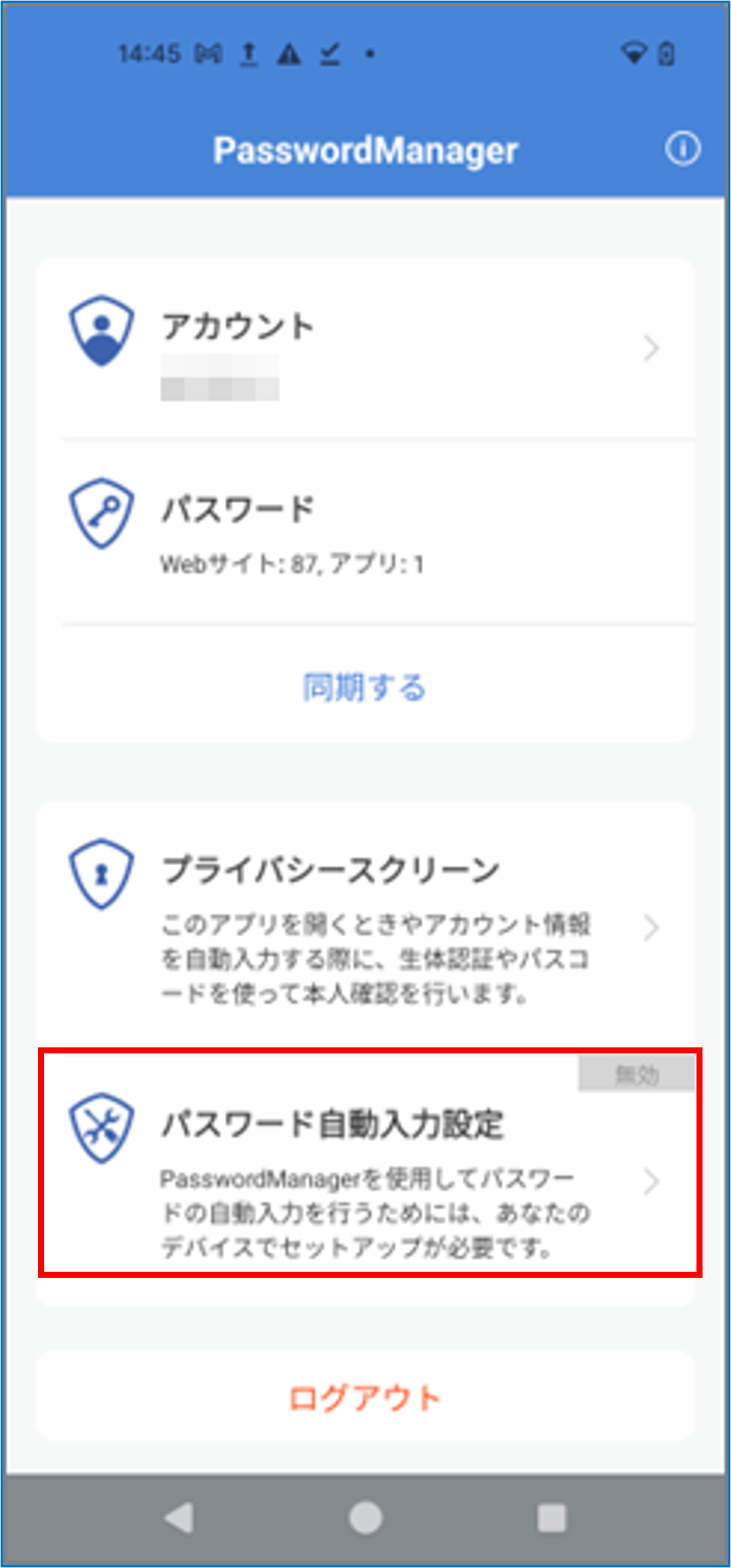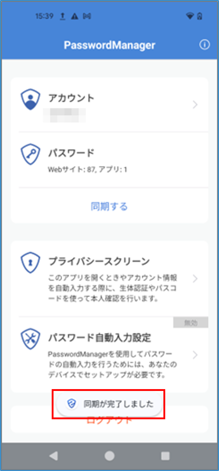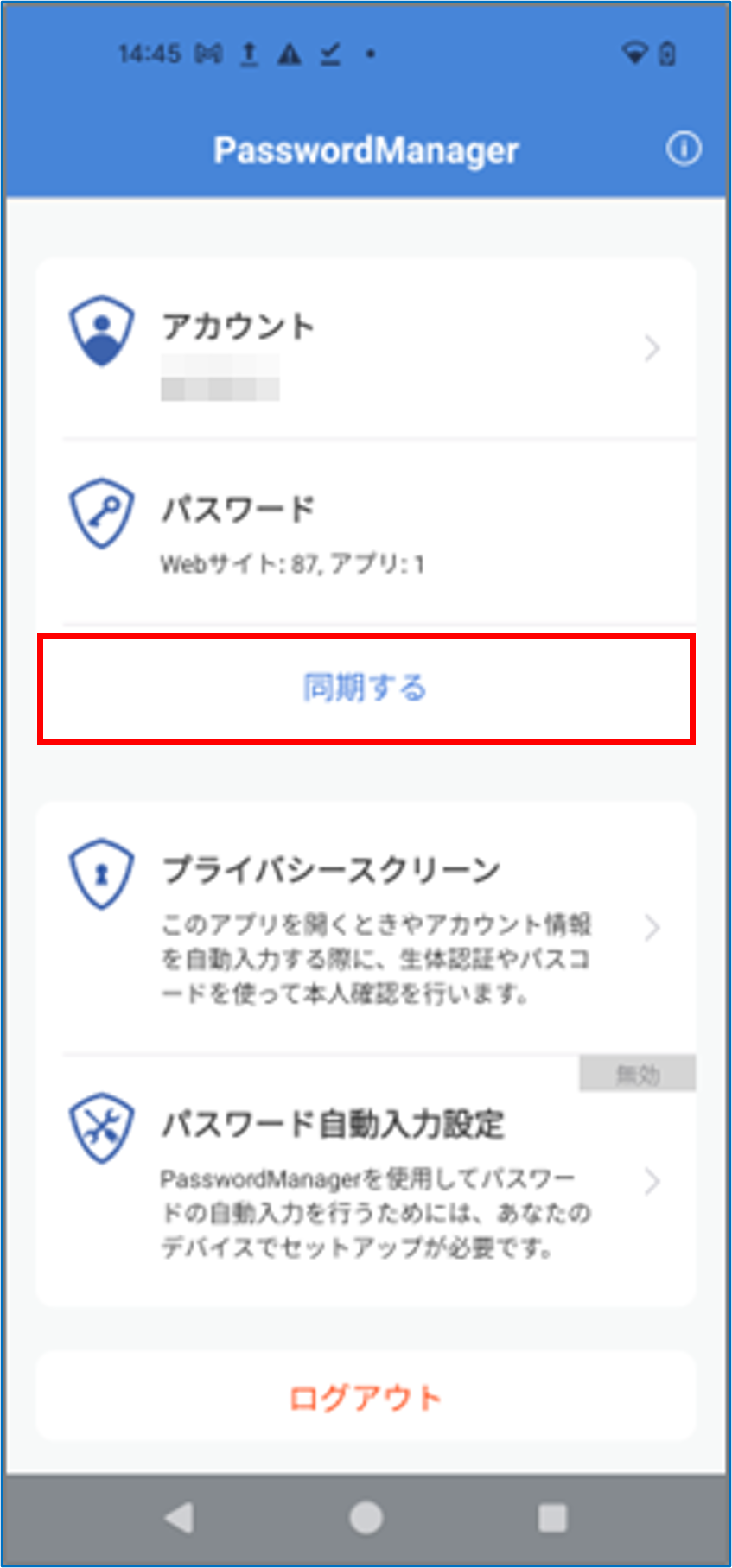 PasswordManagerのホーム画面で[同期する]をタップする