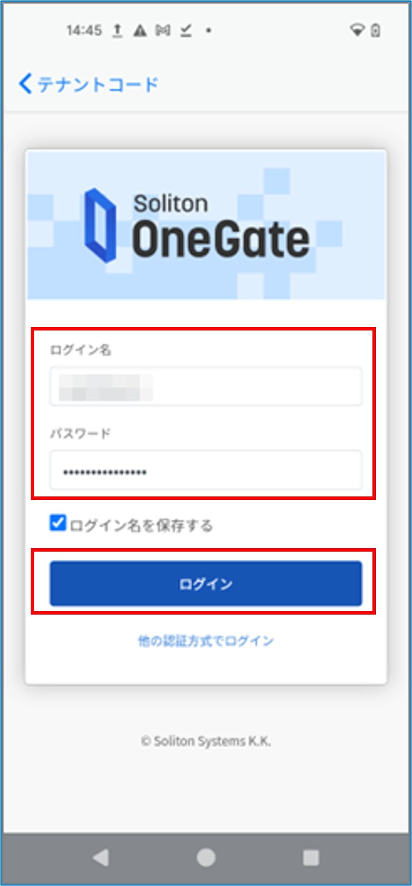 OneGateのログイン名、パスワードを入力し、[ログイン]をタップする
