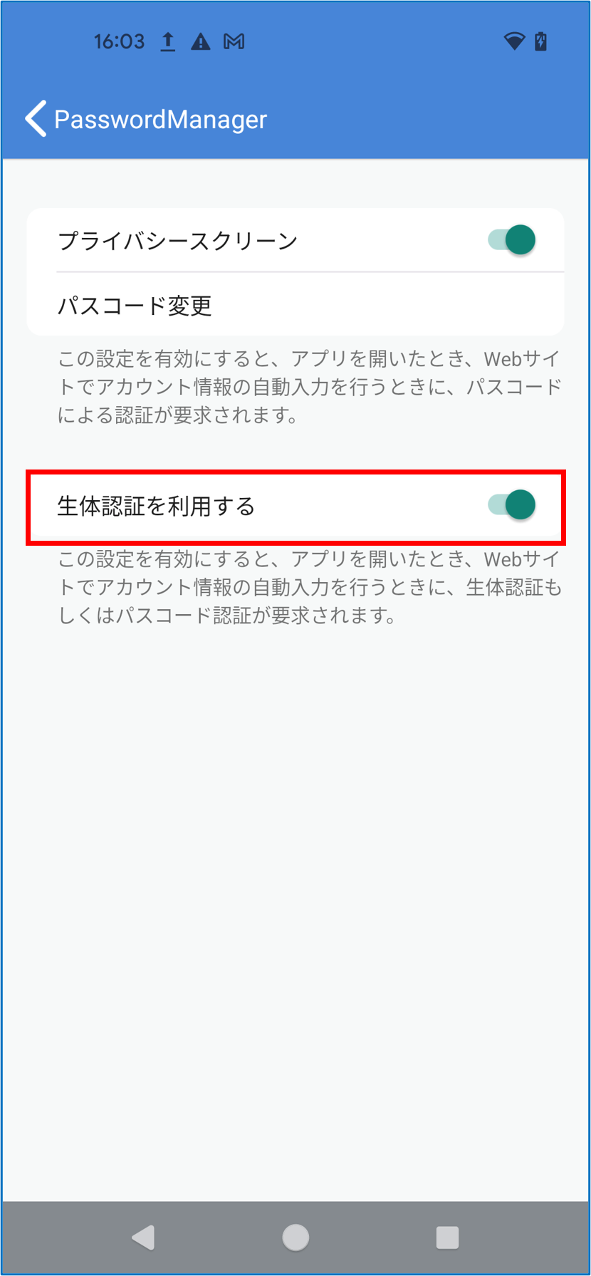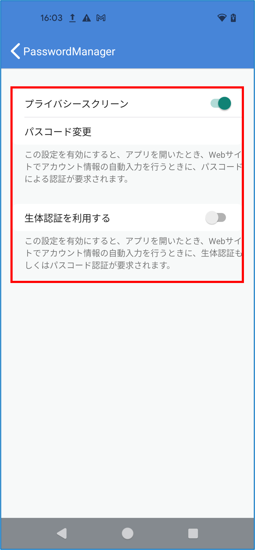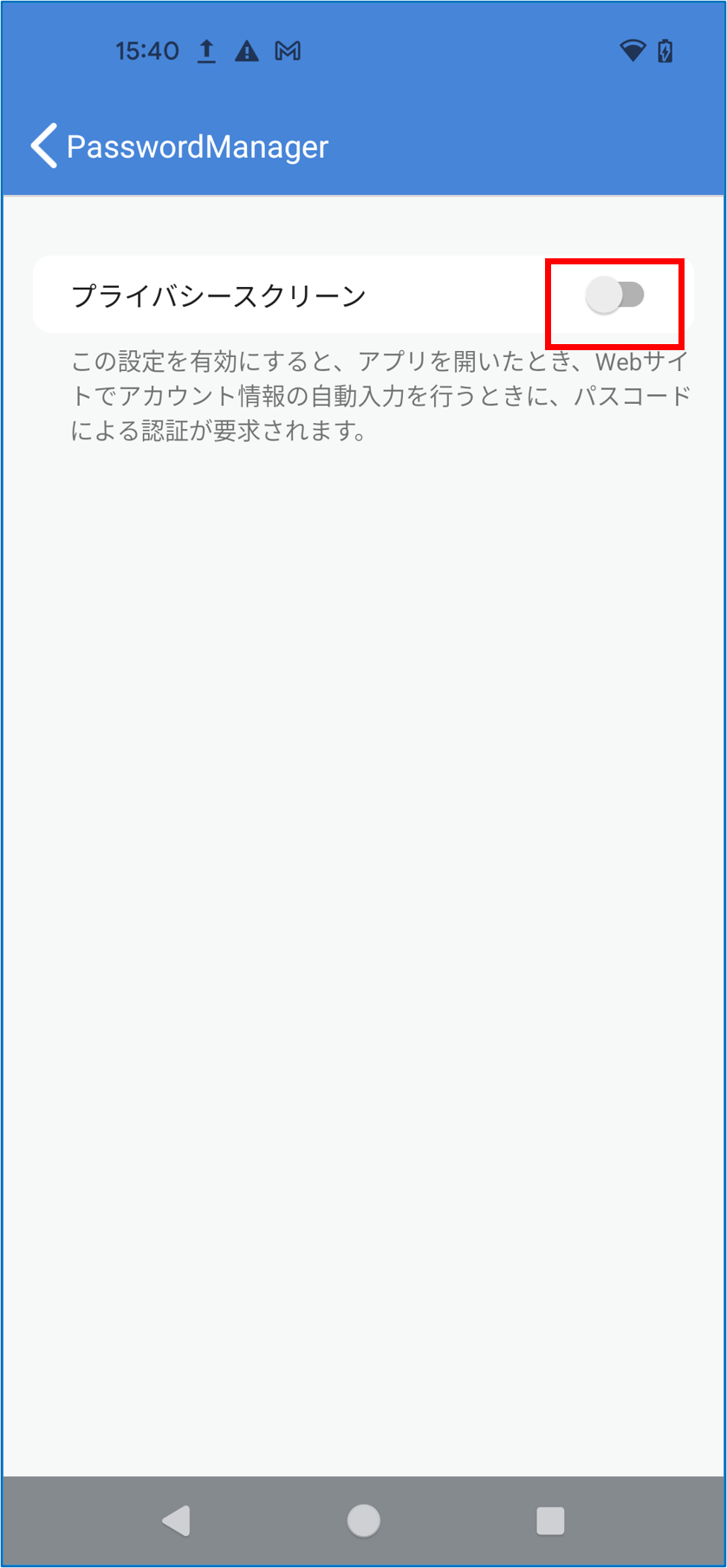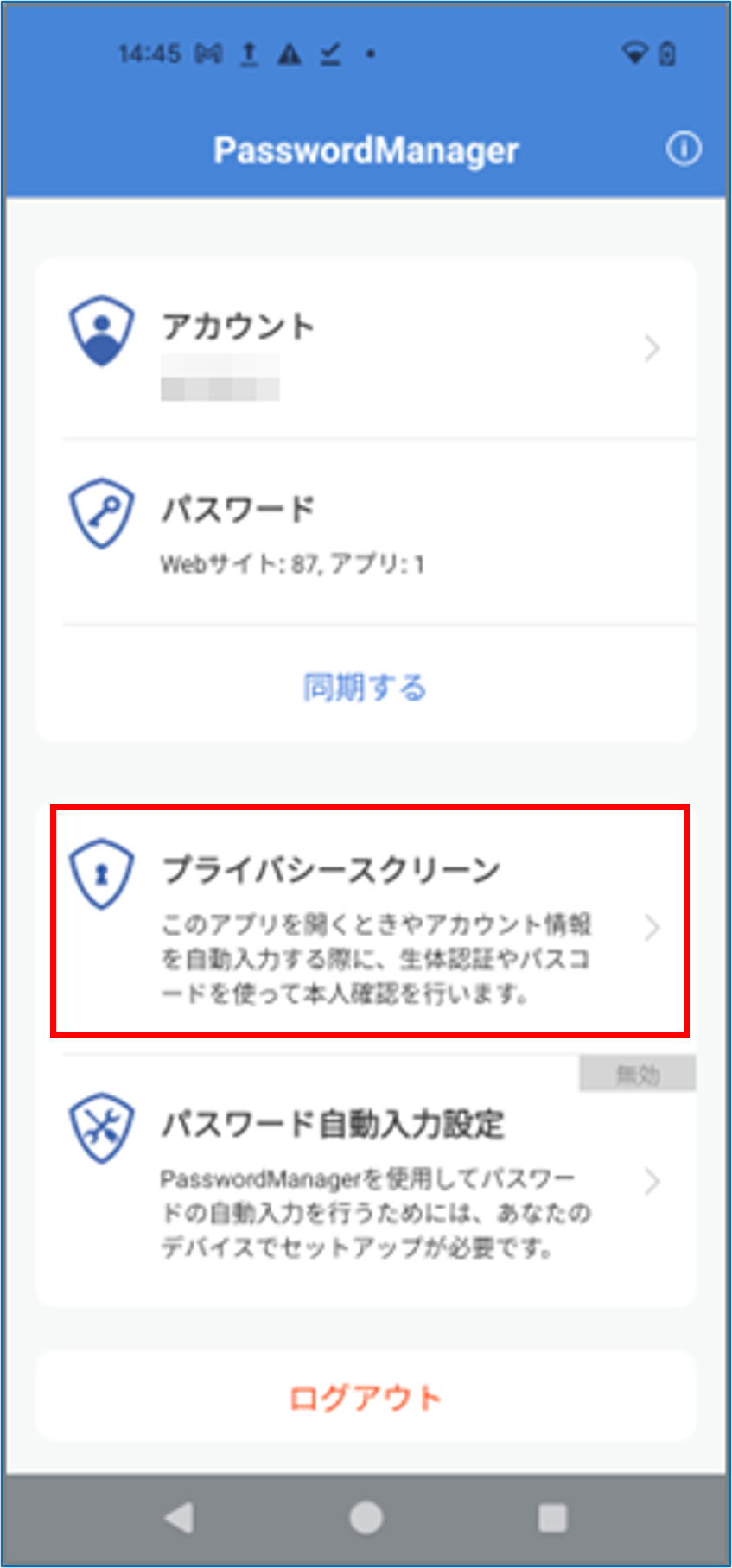 PasswordManagerのホーム画面で[プライバシースクリーン]をタップする