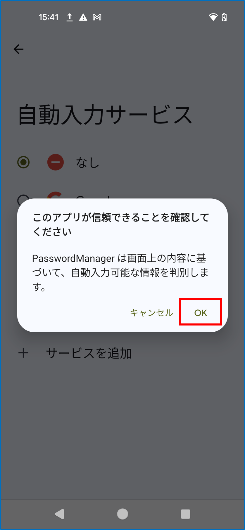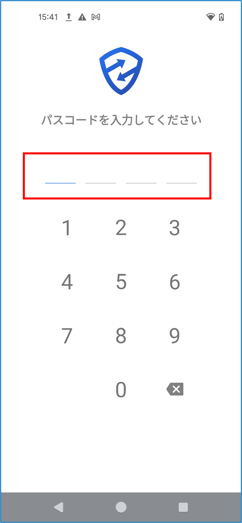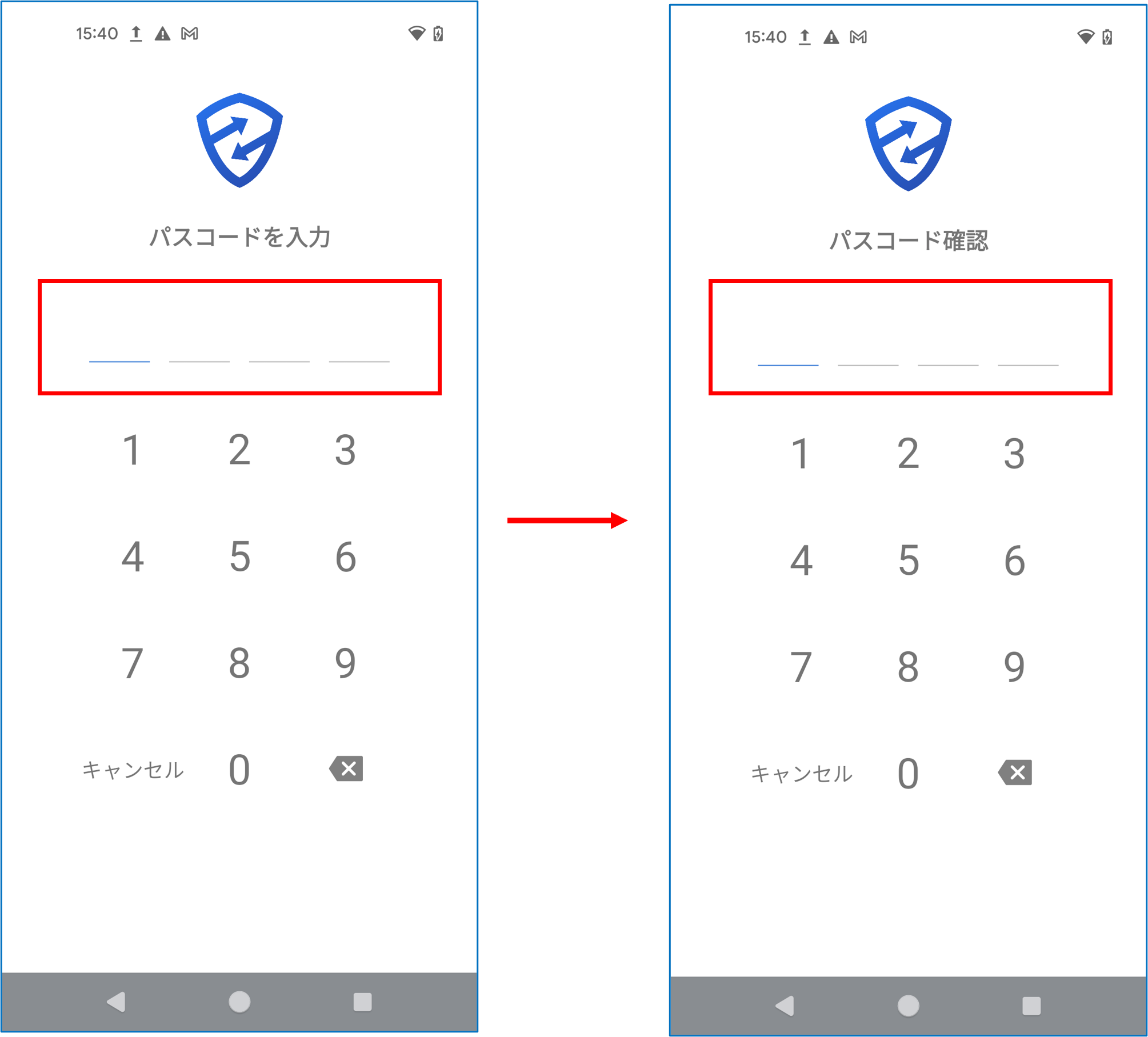 パスワードの入力画面、確認画面にAndroid端末のパスコードを続けて入力する
