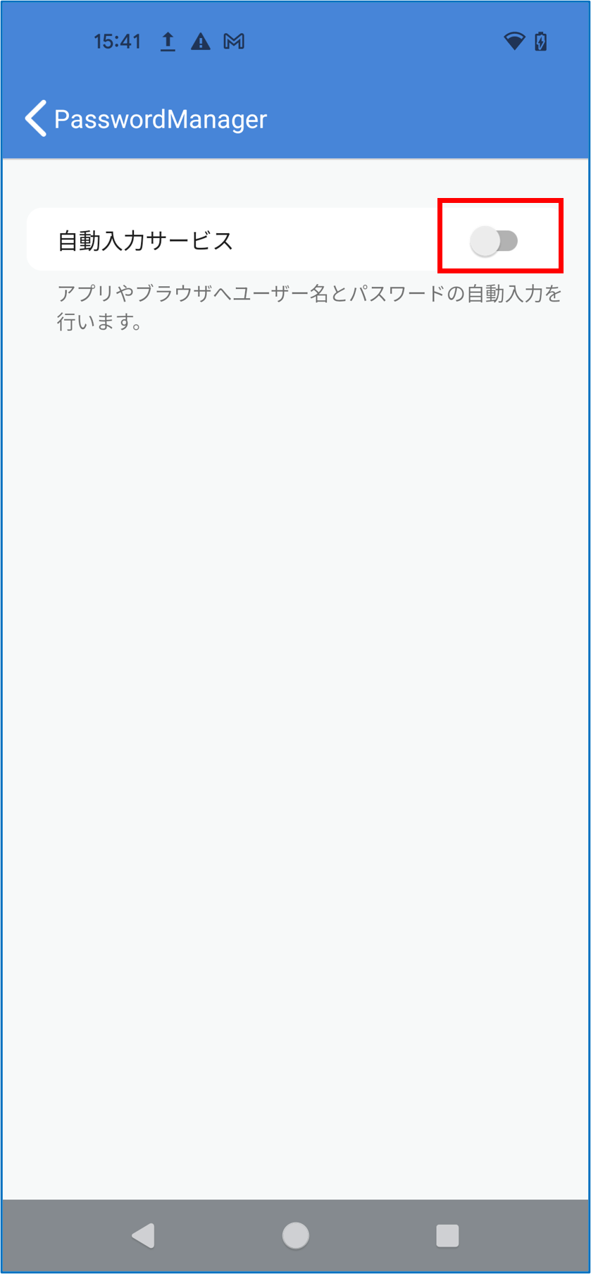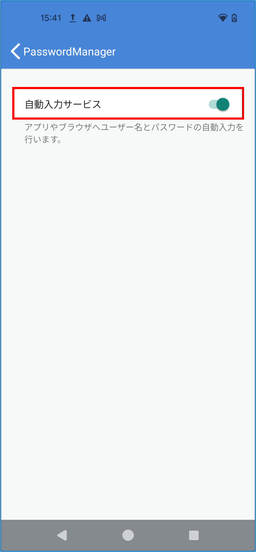 代理入力サインオン対象アプリへのログイン時にパスワードの自動入力(代理入力)を実行する場合、PasswordManagerの「パスワード自動入力設定」を有効にする必要があります。