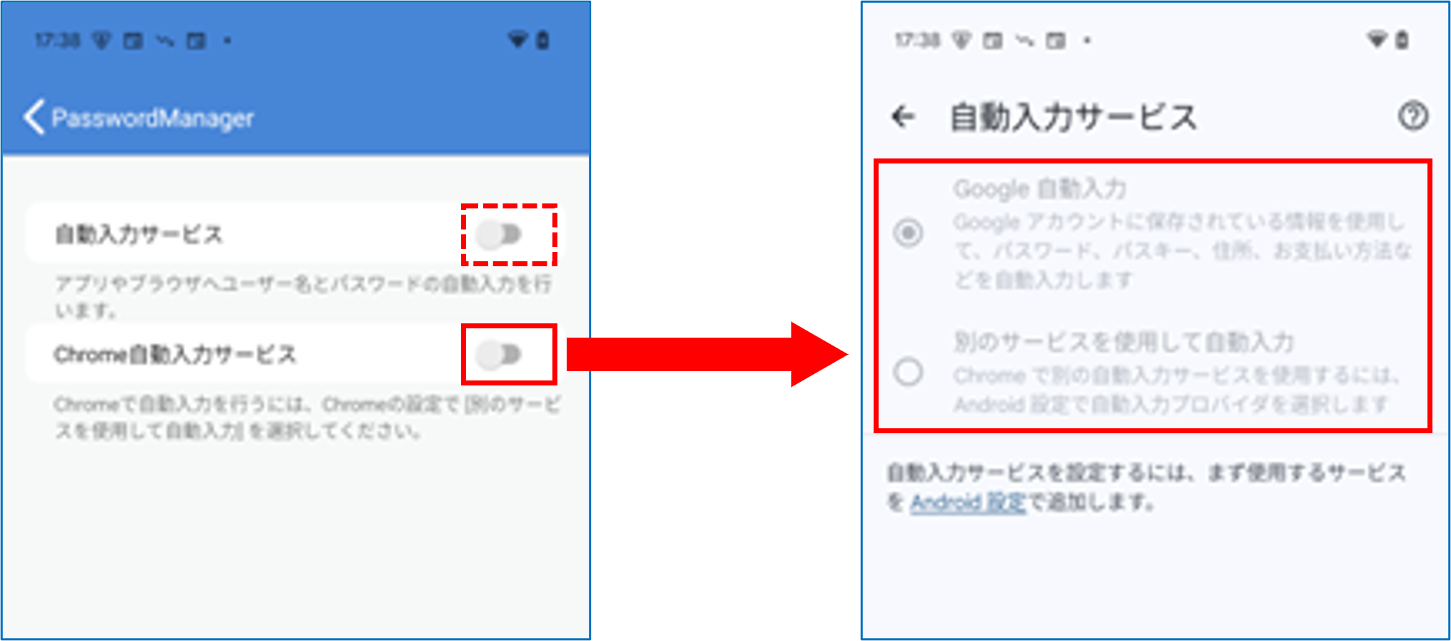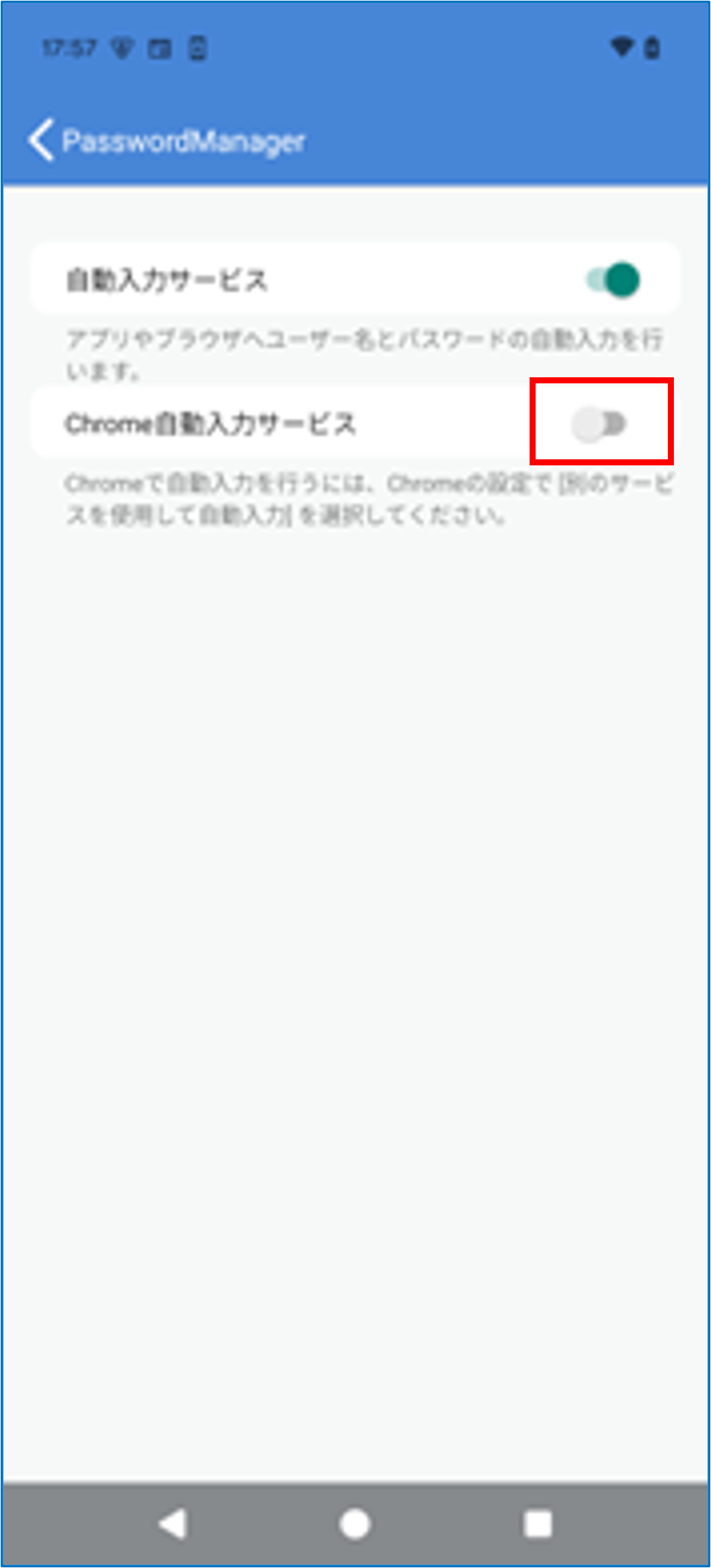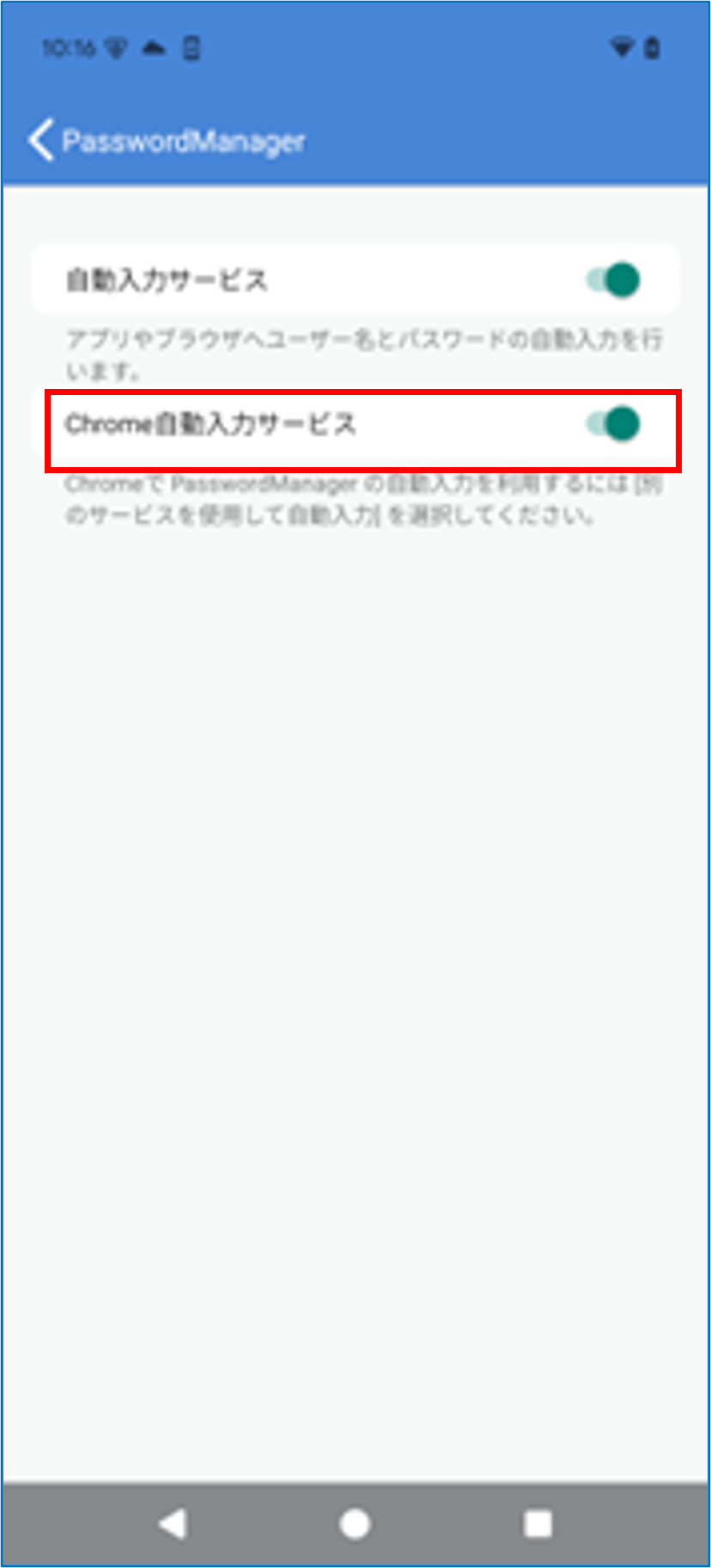 PasswordManagerアプリを開き、ホーム画面で[パスワード自動入力設定]をタップして[Chrome自動入力サービス]が有効になったことを確認する