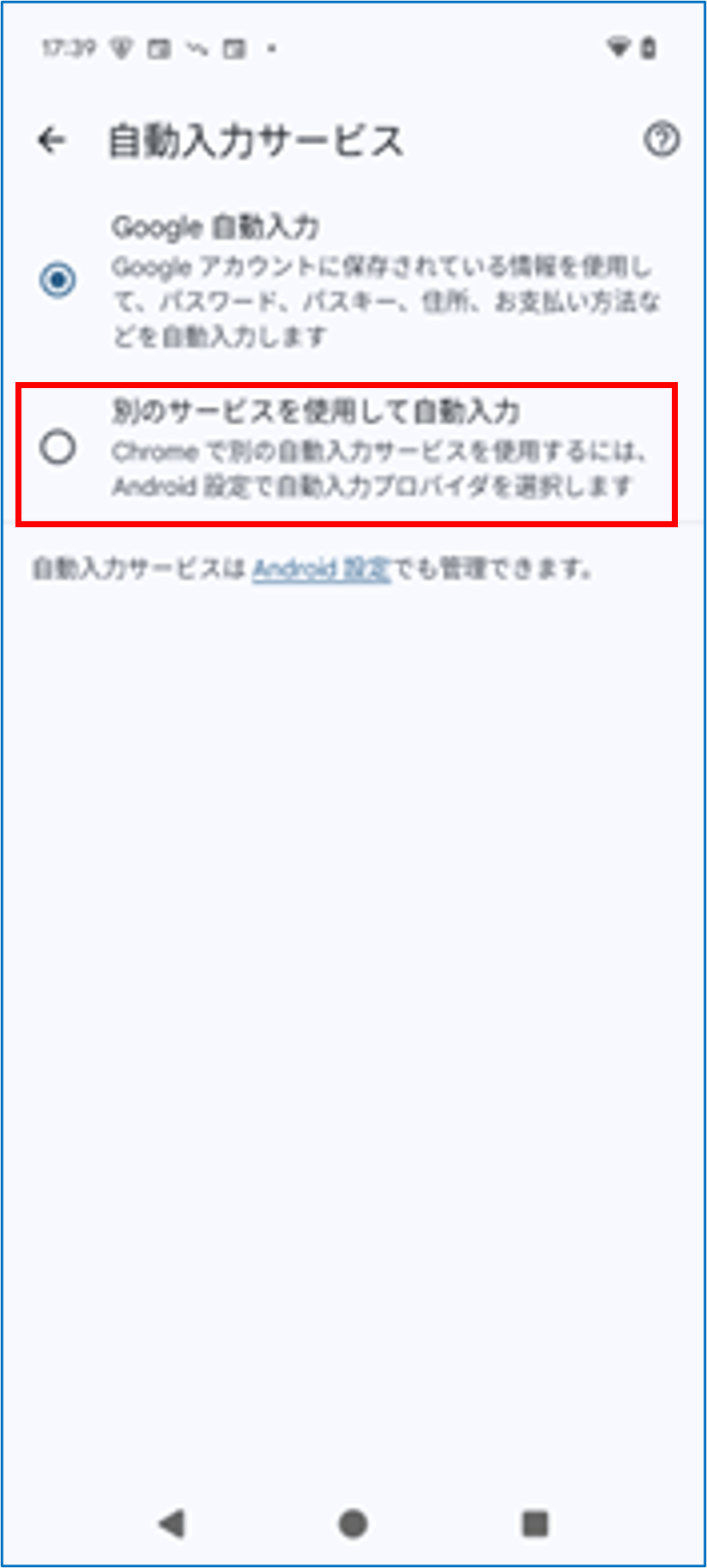 [Chrome自動入力サービス]を選ぶとChromeブラウザに遷移するので、[別のサービスを使用して自動入力] をタップする