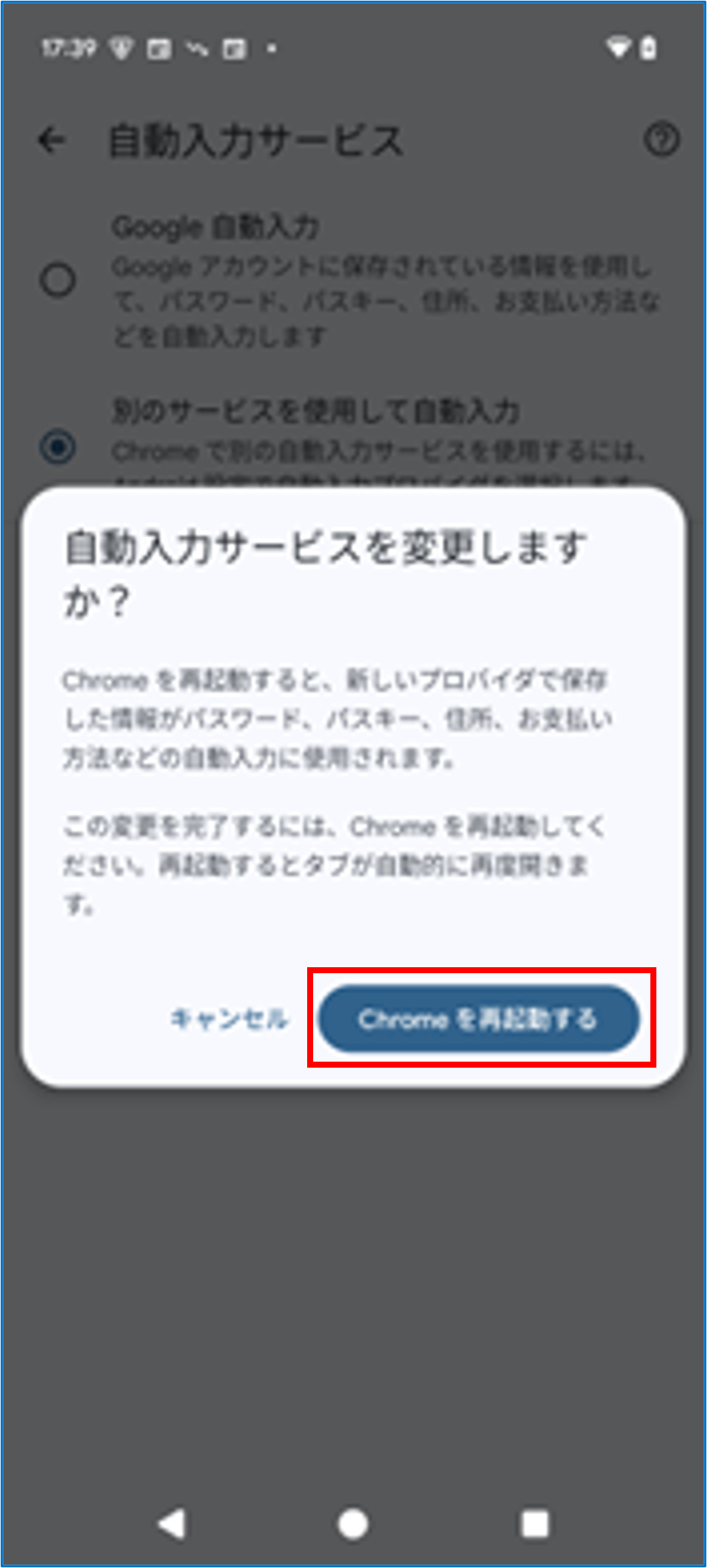 「自動入力サービスを変更しますか」という確認メッセージが表示されるので、[Chromeを再起動する]をタップする