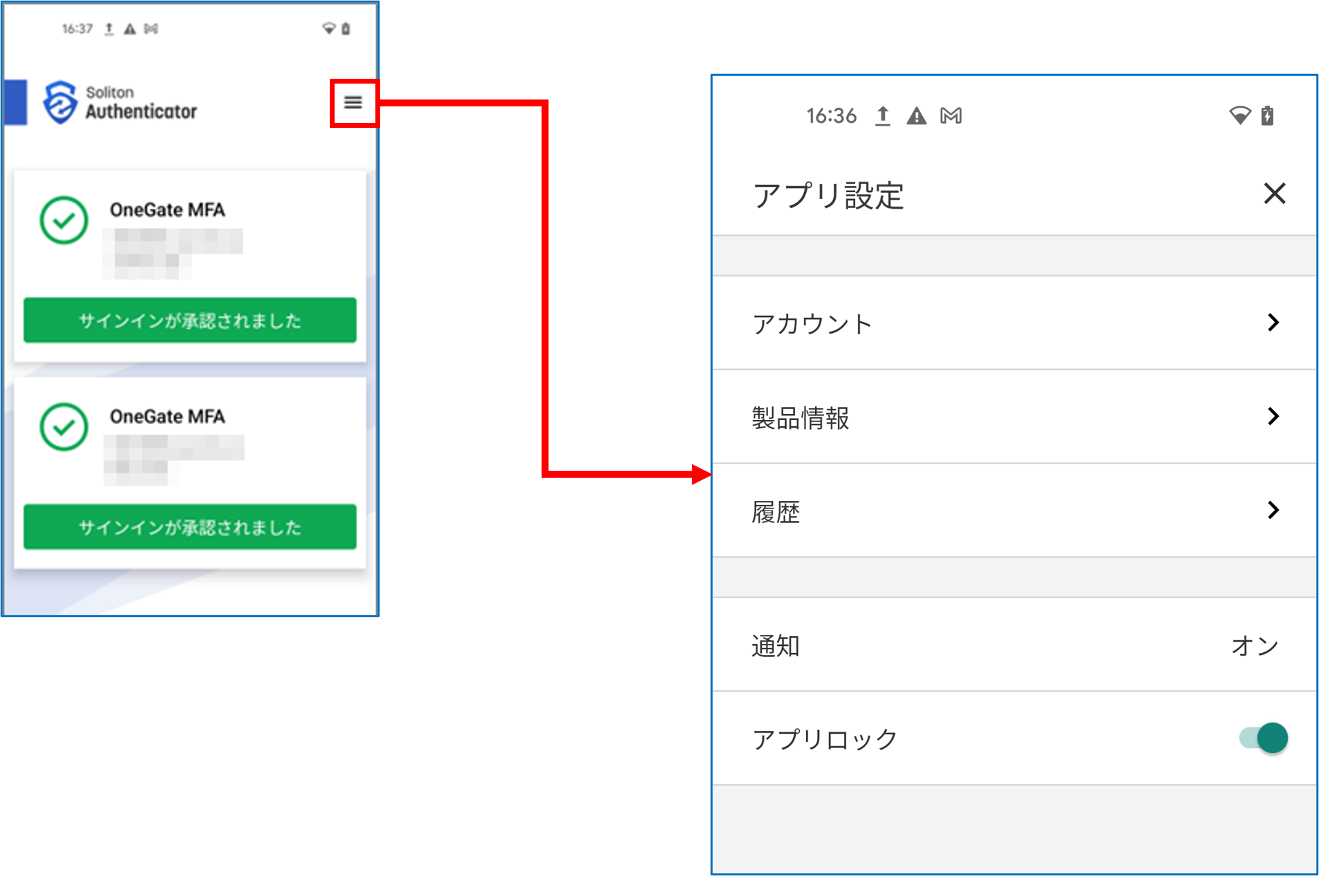 Authenticatorホーム画面の右上の[メニューアイコン]をタップすると、「アプリ設定」メニューが表示されます。
