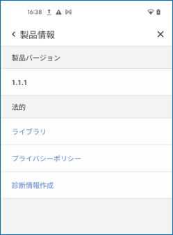 「アプリ設定」メニューの[製品情報]をタップすると、Authenticatorのバージョンや使用しているライブラリについて確認できます。
