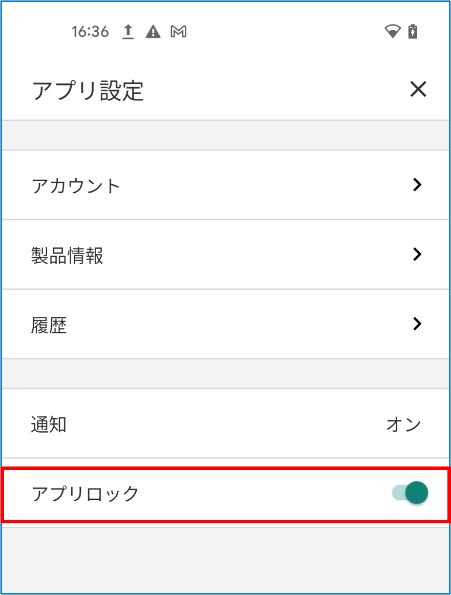 「アプリ設定」メニューの[アプリロック]のトグルスイッチをタップすると、アプリロックの有効/無効を切り替えることができます。