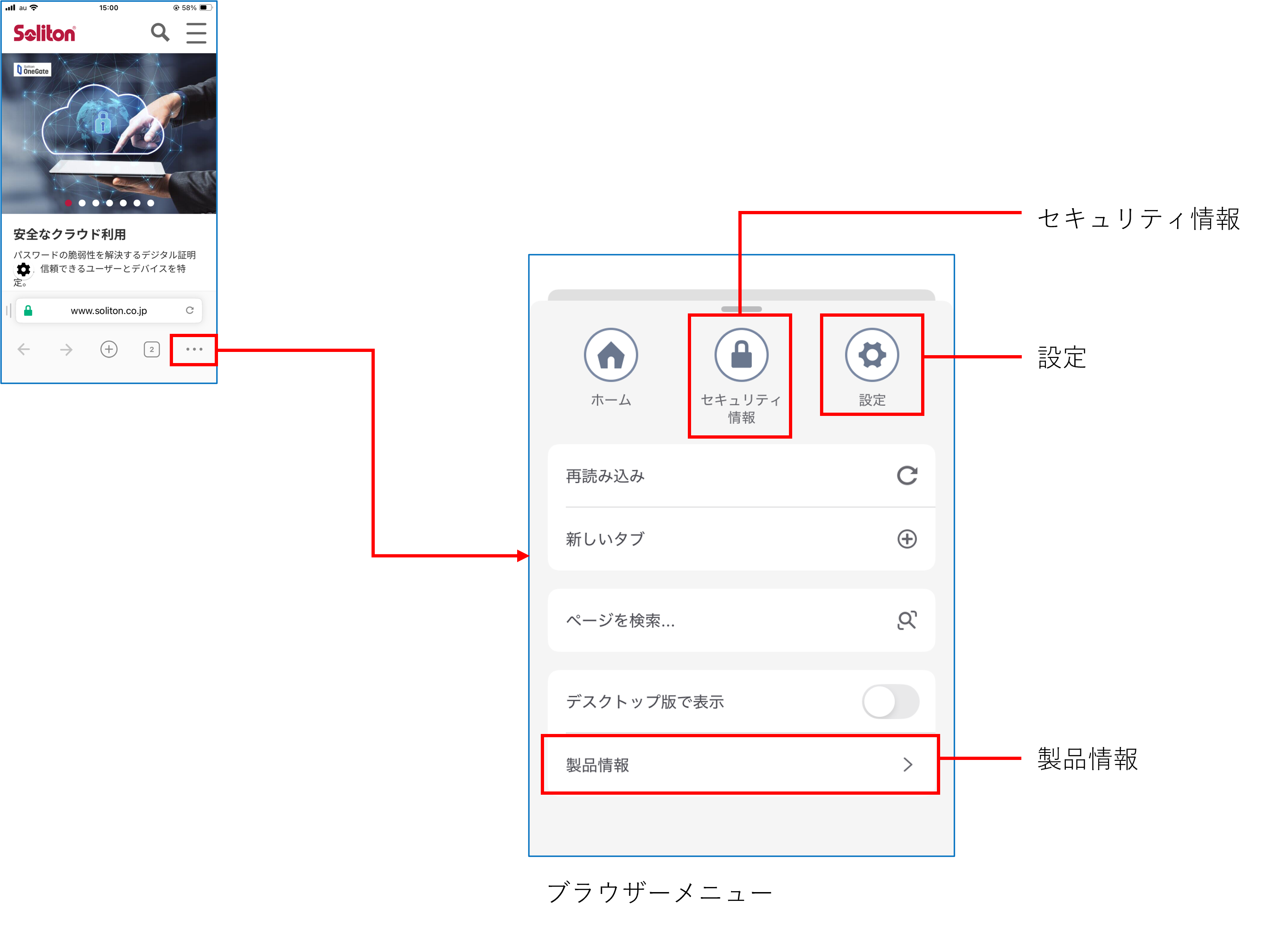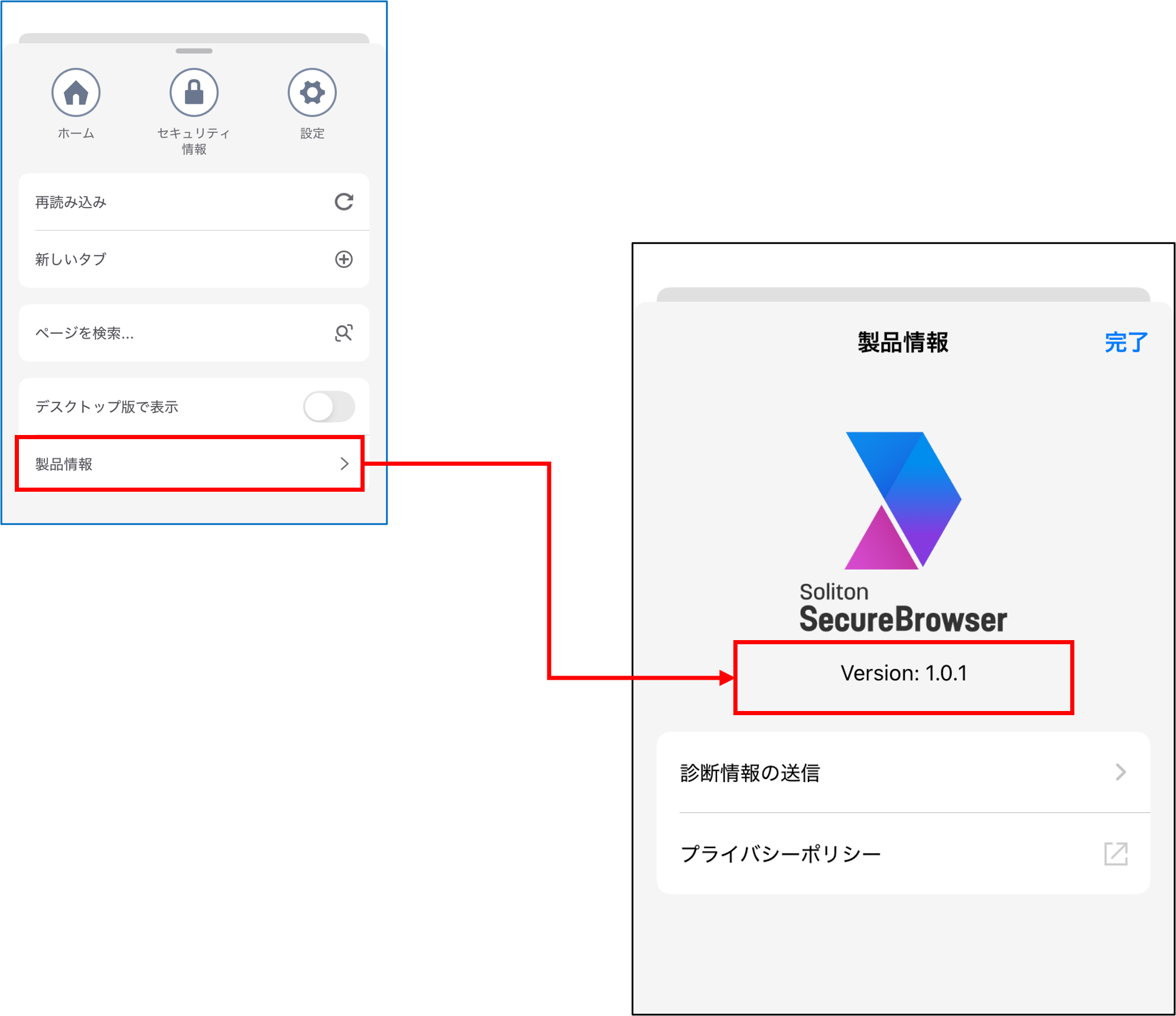 ブラウザーメニューの[製品情報]をタップすると、SecureBrowserのバージョンを確認できます。