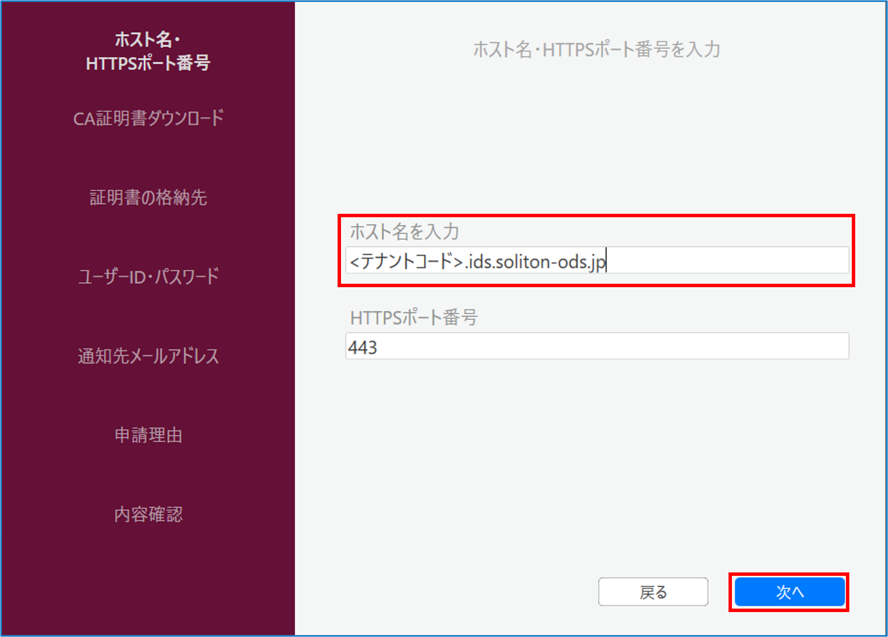CA証明書の信頼設定完了後、KeyManagerの画面(ホスト名・HTTPSポート)に戻り、[次へ]をクリックします。