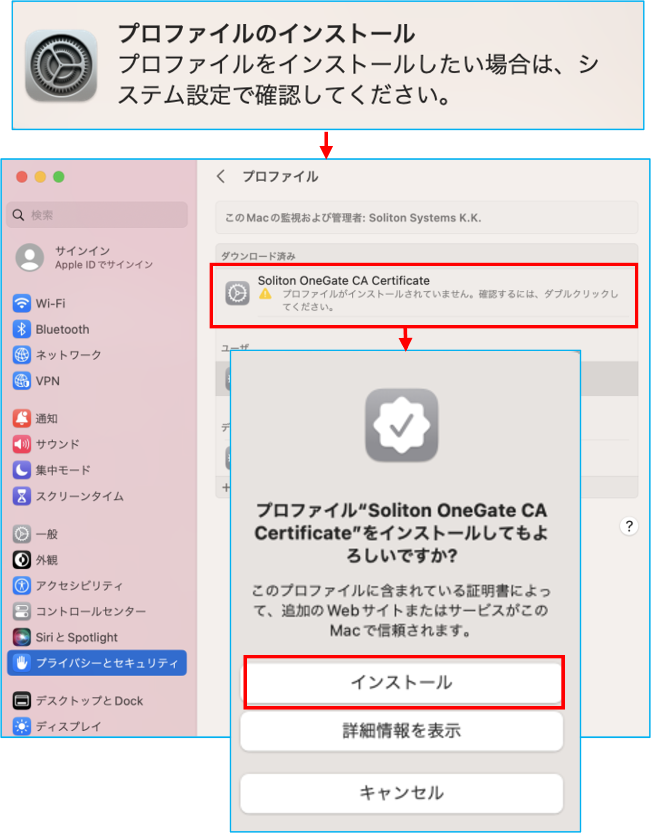 ダウンロードを許可し、「プロファイルのインストール」通知または[システム設定]>[プライバシーとセキュリティ]>[プロファイル]を開き、ダウンロードされたCA証明書のプロファイルの[インストール]をクリックします。