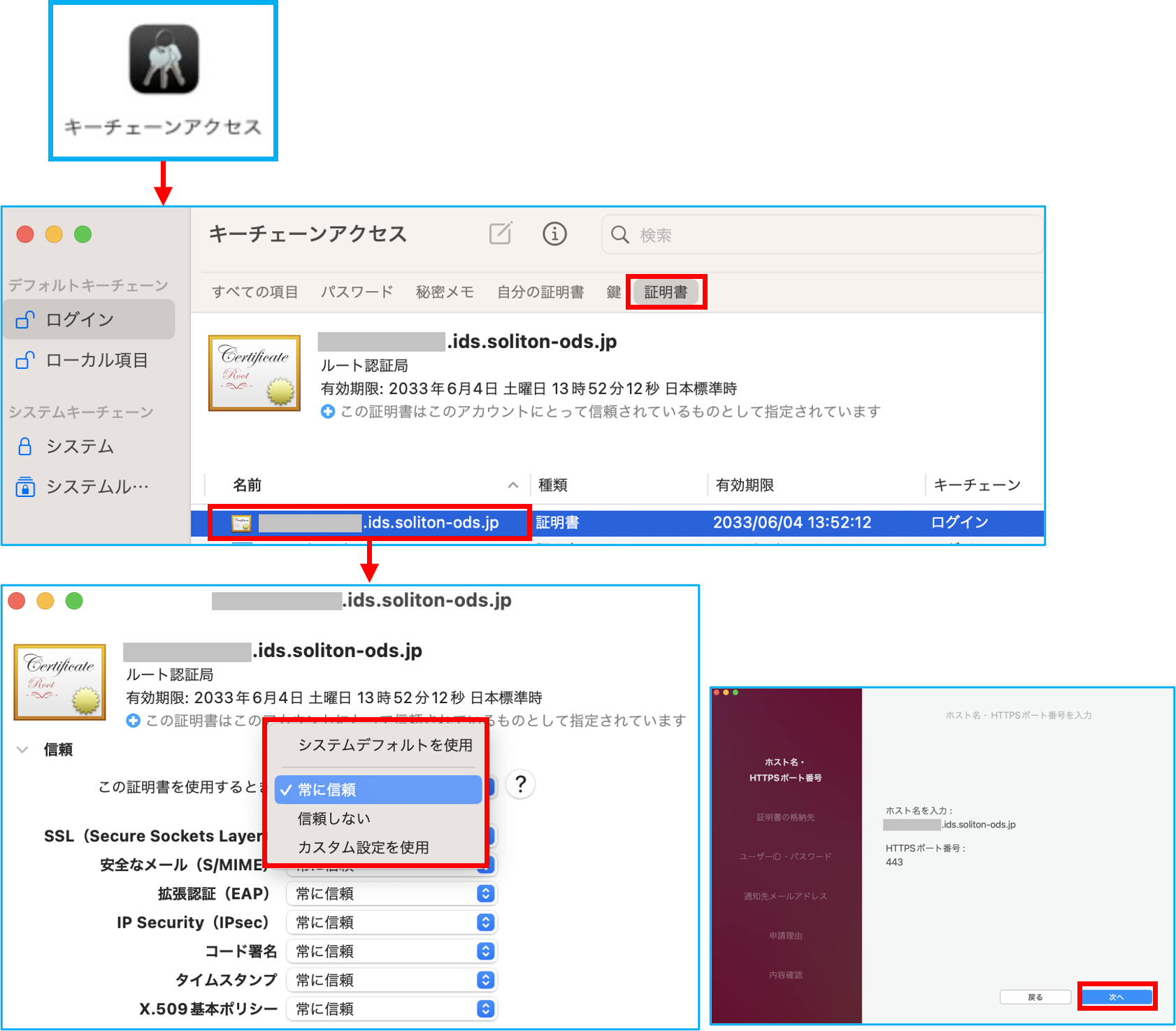 [キーチェーンアクセス]>[デフォルトキーチェーン:ログイン]>[証明書]タブから、インストールしたCA証明書を開き、[信頼]>[この証明書を利用する時]で[常に信頼]を選択します。