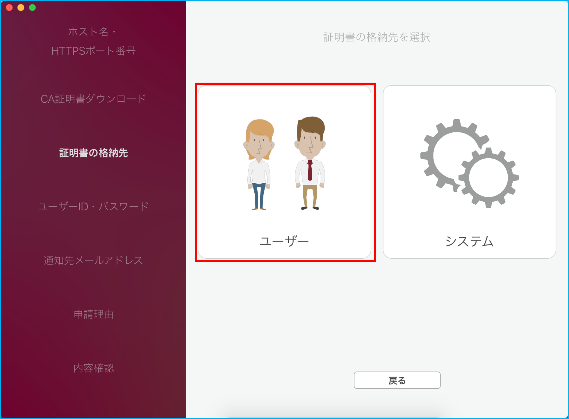 クライアント証明書の用途に合わせ、証明書の格納先を「ユーザー」か「システム」から選択する