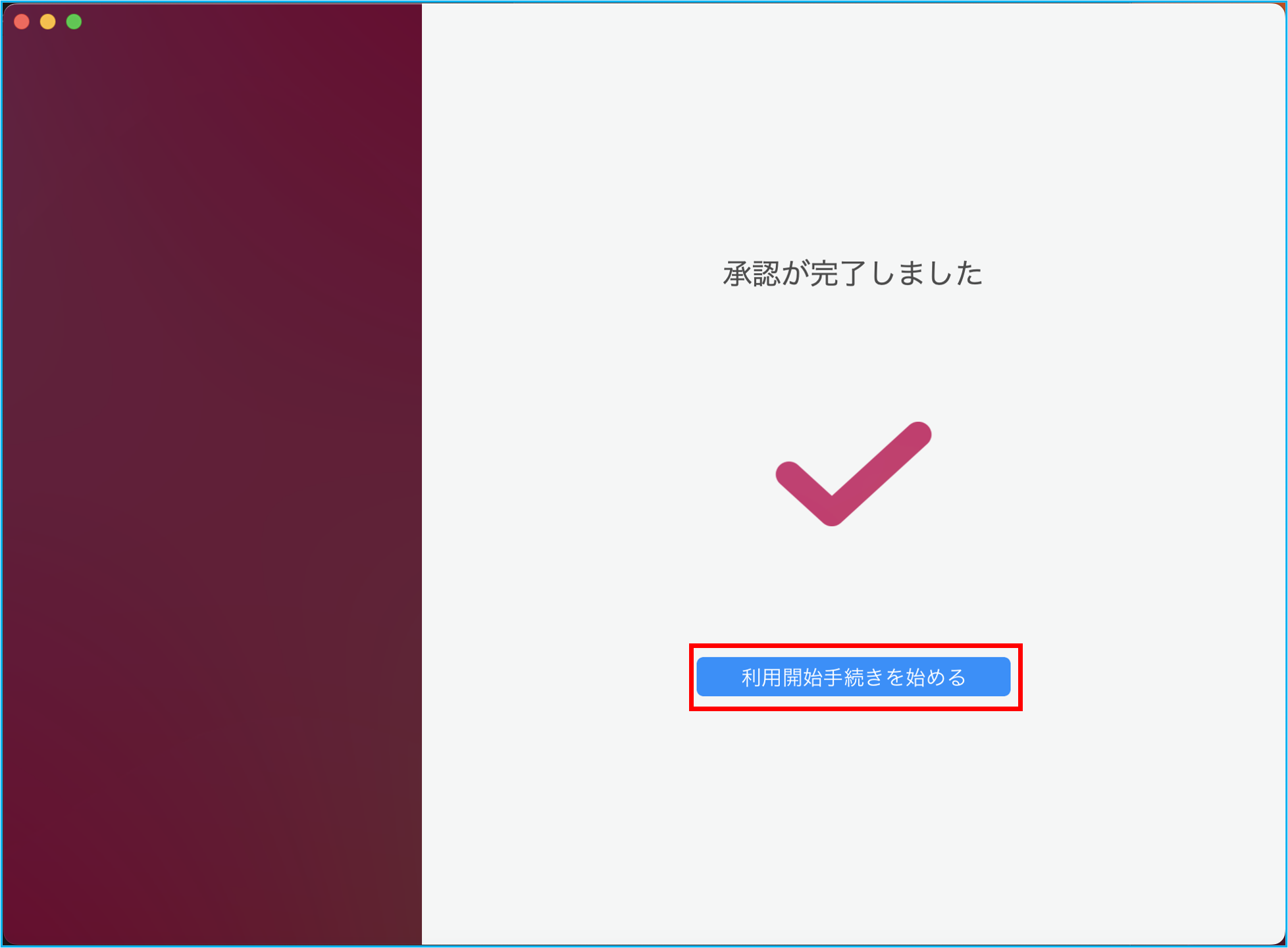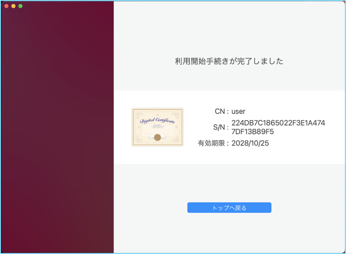証明書のインストールが完了すると、「利用開始手続きが完了しました」というメッセージが表示されます。