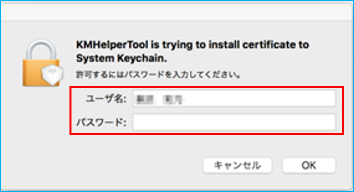 CA証明書の画面を閉じると、パスワードの入力画面が表示されるので、macOSの管理者パスワードを入力します。