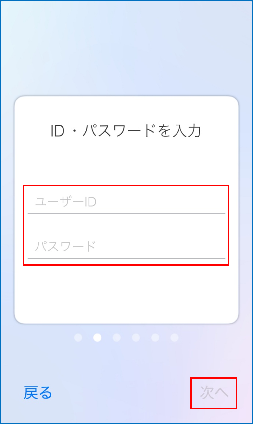 OneGateで認証するユーザーID、パスワードを入力し、[次へ]をタップする