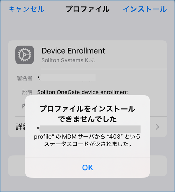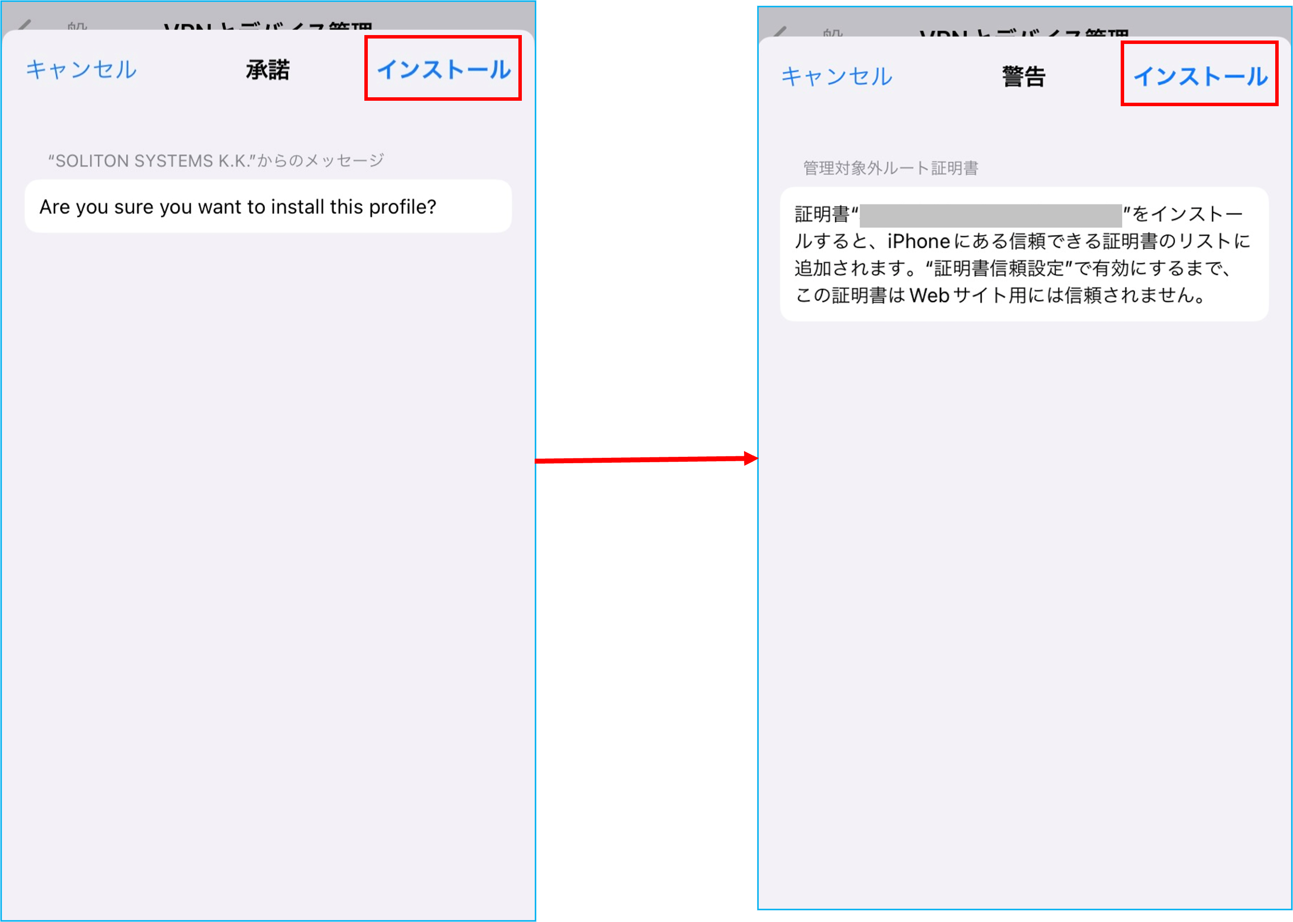 「承諾」画面、「警告」画面で続けて[インストール]をタップする