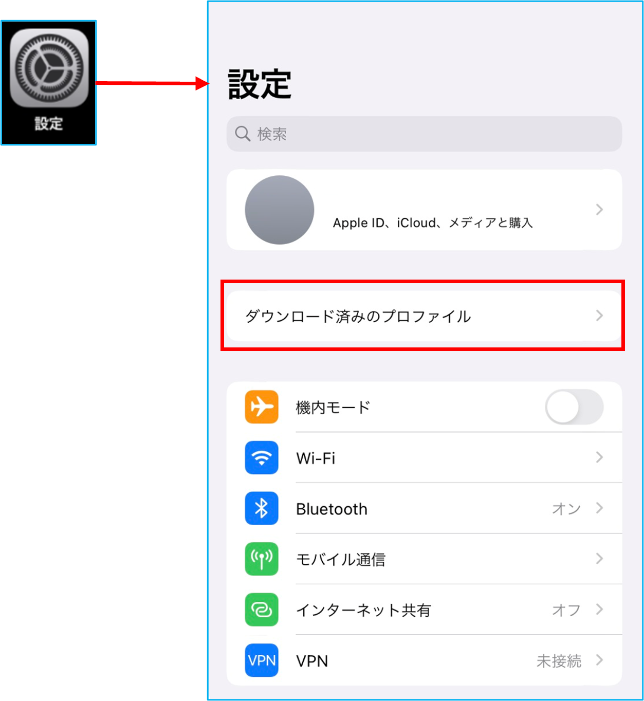 iOSデバイスの[設定]アプリを開き、[ダウンロード済みのプロファイル]をタップする