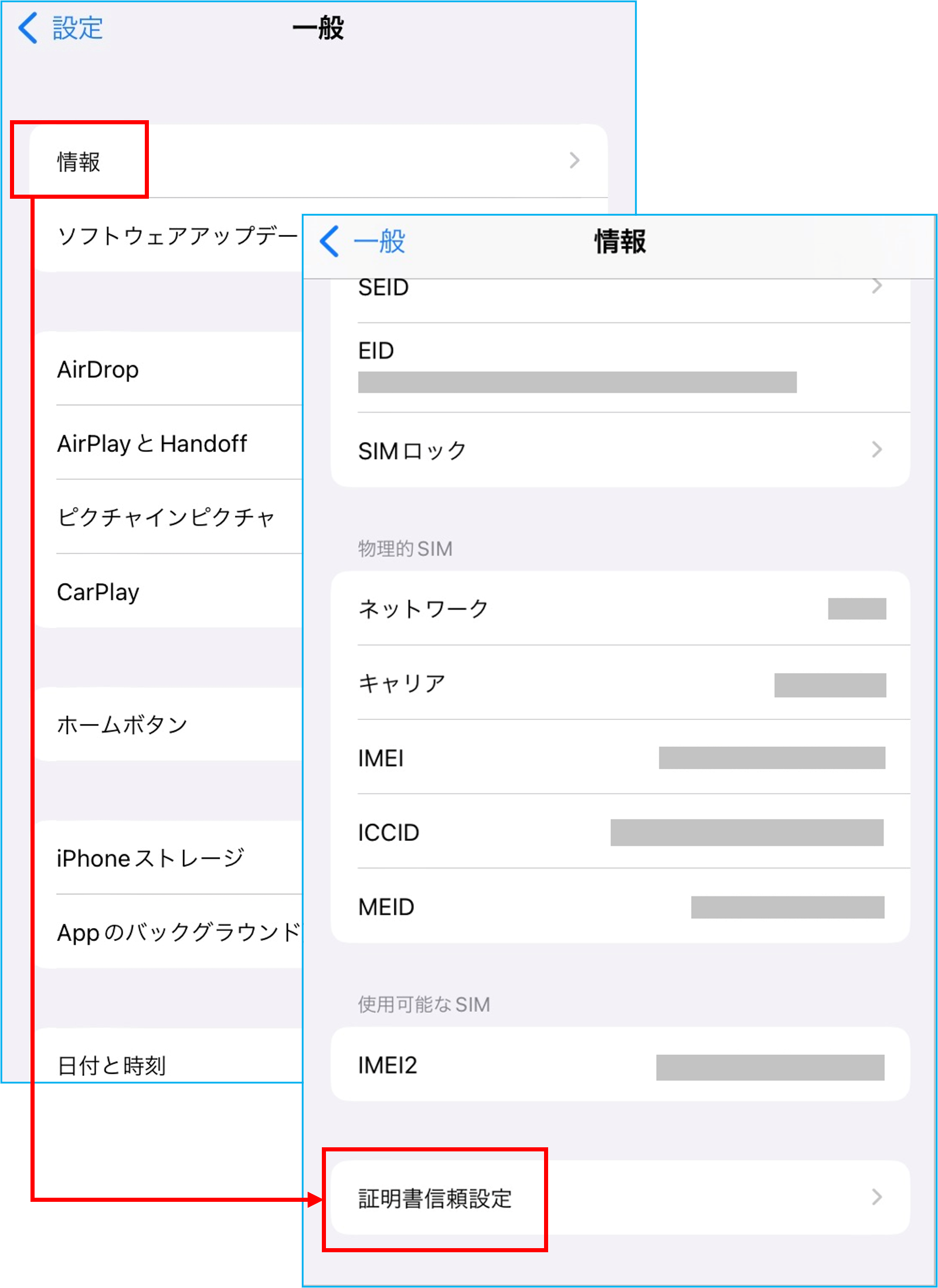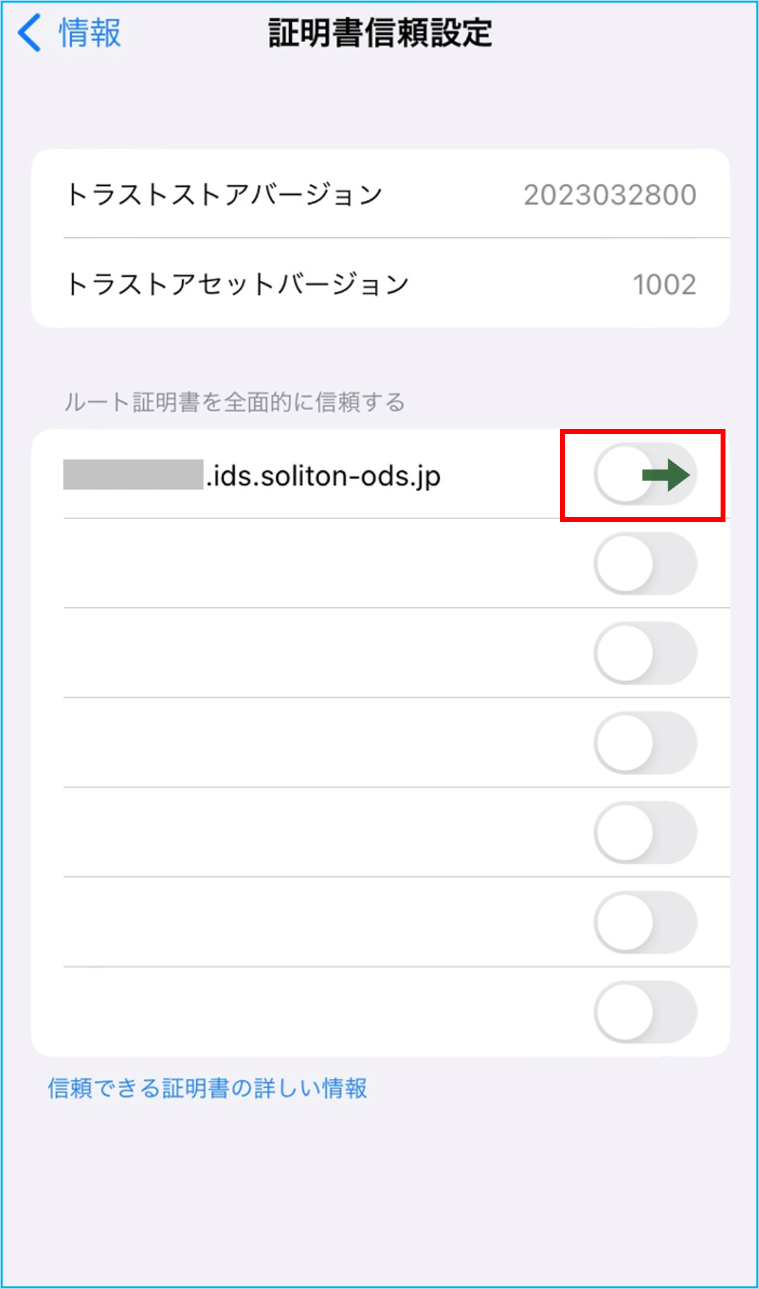 再度、[設定]アプリを開き、[一般]>[情報]>[証明書信頼設定]をタップする